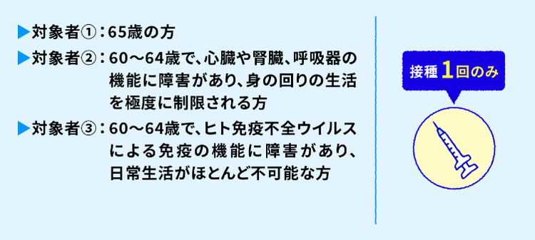 定期接種の機会は生涯で1回(一般的には65歳の1年間)です4)。