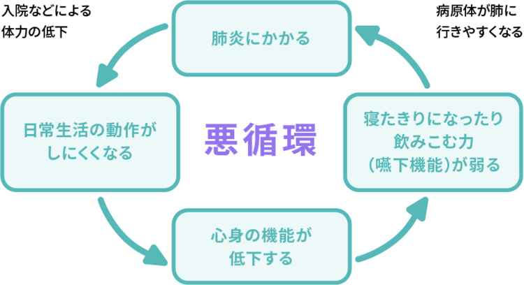 また、肺炎にかかり体力が奪われることで、ふたたび肺炎にかかりやすい状態になります。肺炎は、実際に何度も繰り返すうちに全身が弱ってしまうことがあり、健康寿命を損なうことにもつながります。いまの健康を維持して健康寿命をのばすため、また、人にうつさないよう、うつされないようにするためにも、肺炎はまず予防すべき病気、と捉えていただければと思います。