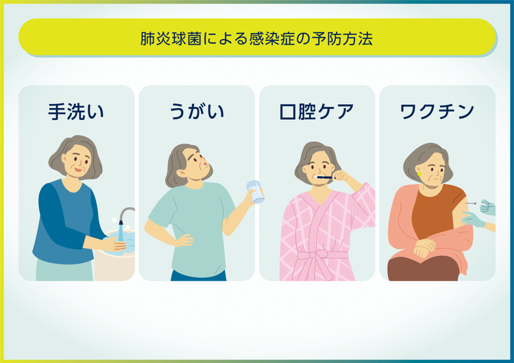 手洗い、うがいをして肺炎球菌を体の中に入れないことも大切ですし、口腔ケアをして口の中を清潔にしておくことや肺炎球菌ワクチンを接種する方法があります。
