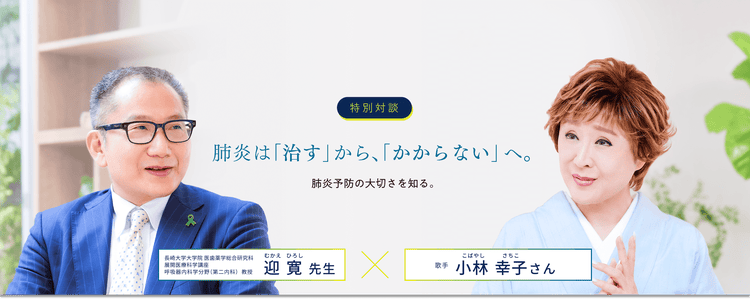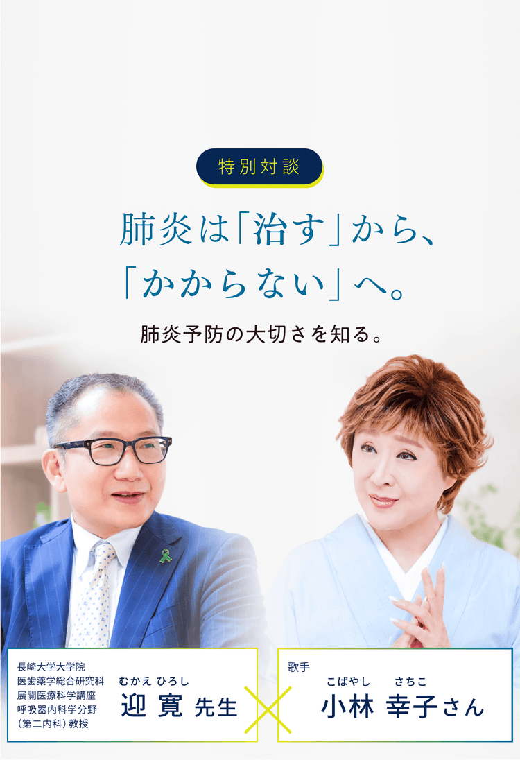 厚生労働省と私たち医師が一緒になって、一般の方に「呼吸器感染症」という病気を知ってもらうための活動をしています。今日、小林さんと対談させていただいて、小林さんのように長く芸能界で活躍されて、色々なメディアで情報が得られる環境にいる方でも、肺炎球菌などの高齢者にとって予防が必要な病気の情報が届いていないことが分かり、ますます呼吸器感染症週間を通じて活動することの意義は大きいと感じました。