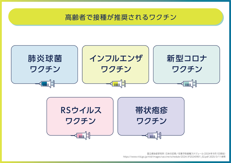 ここに示したワクチンは、高齢者が接種することを推奨されているワクチンです。この中でも、インフルエンザワクチン、コロナワクチン、RSウイルスワクチン、肺炎球菌ワクチンは、病気の原因となる細菌やウイルスが感染して、肺炎など呼吸器の病気を起こしてしまうことを予防する目的のワクチンです。