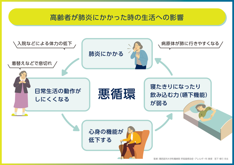 高齢者は肺炎を起こすと入院することもあって、そうすると、体力が落ちて、今まで普通にできていた「着替える」とかの動作でも息切れしたりするようになります。そして、動くと苦しいから動かなくなって、心身の機能が低下していき、ひどくなると寝たきりになったり、物を飲み込む力が弱まっていくこともあります。