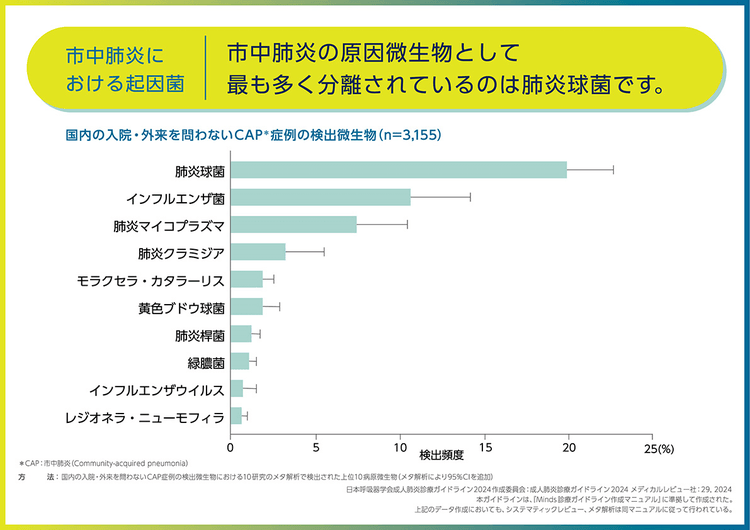 インフルエンザになって重症化して肺炎が起こることもあります。ただ、先ほどご説明した普通の町の中で健康な人がかかる肺炎の原因として最も多いのは、「肺炎球菌」という細菌です。この他にも、グラフに示したようにインフルエンザ菌や肺炎マイコプラズマなどもあります。