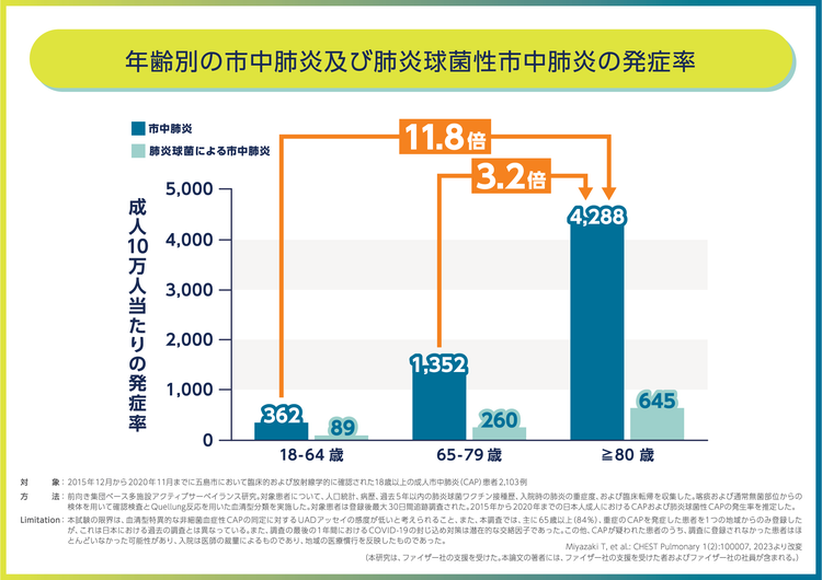 はい、普通の町の中で健康な人がかかる肺炎を「市中肺炎」というのですが、それが年齢によってどのくらい頻度が違うかというと、80歳以上の方では18〜64歳の11.8倍、65〜79歳の3.2倍も発生頻度が高いという調査結果があります。